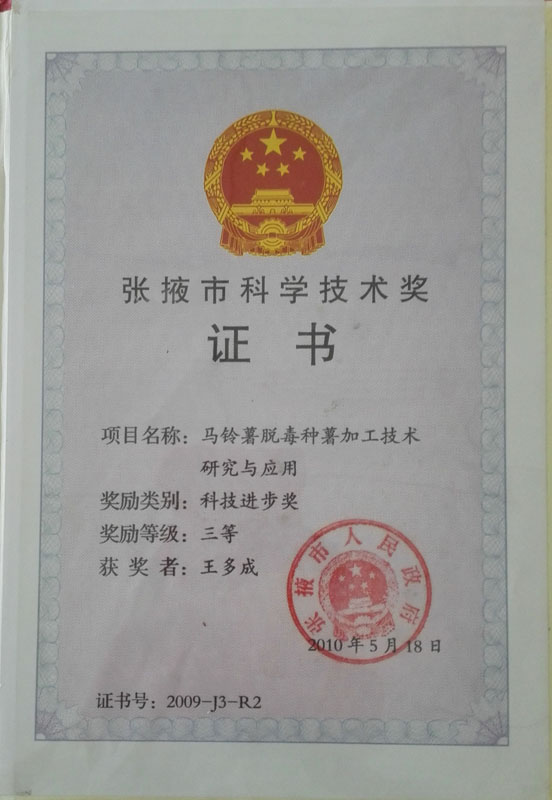 2010年榮獲張掖市科技進步三等獎證書