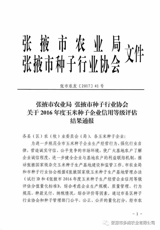 熱烈祝賀張掖市多成農(nóng)業(yè)有限公司被評為2017年度信用等級AAA級企業(yè)!! 2017年2月24日,張掖市農(nóng)業(yè)局、張掖市種子行業(yè)協(xié)會公布的《2016年度玉米種子企業(yè)信用等級評估結(jié)果》中,張掖市多成農(nóng)業(yè)有限公司被評為2016年度信用等級AAA級企業(yè)。 |