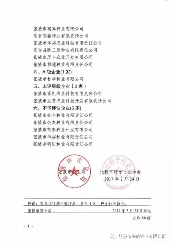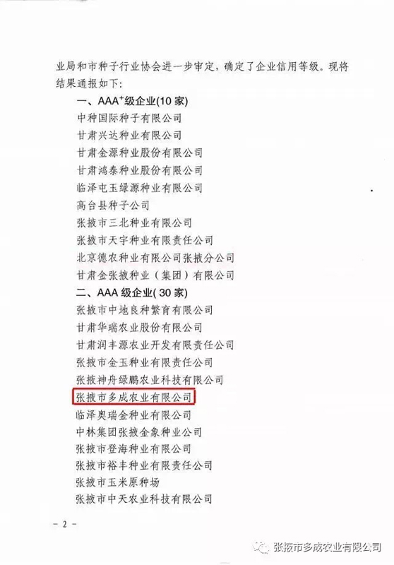 | 熱烈祝賀張掖市多成農(nóng)業(yè)有限公司被評為2017年度信用等級AAA級企業(yè)!! | ||